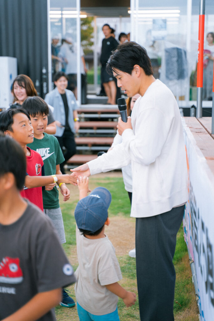 また、トークショーの最後には、抽選で数名にサイン入りユニフォームをプレゼント。さらに、終了後には子どもたち一人ひとりと握手を交わすサプライズもあり、会場全体が笑顔と歓声に包まれました。